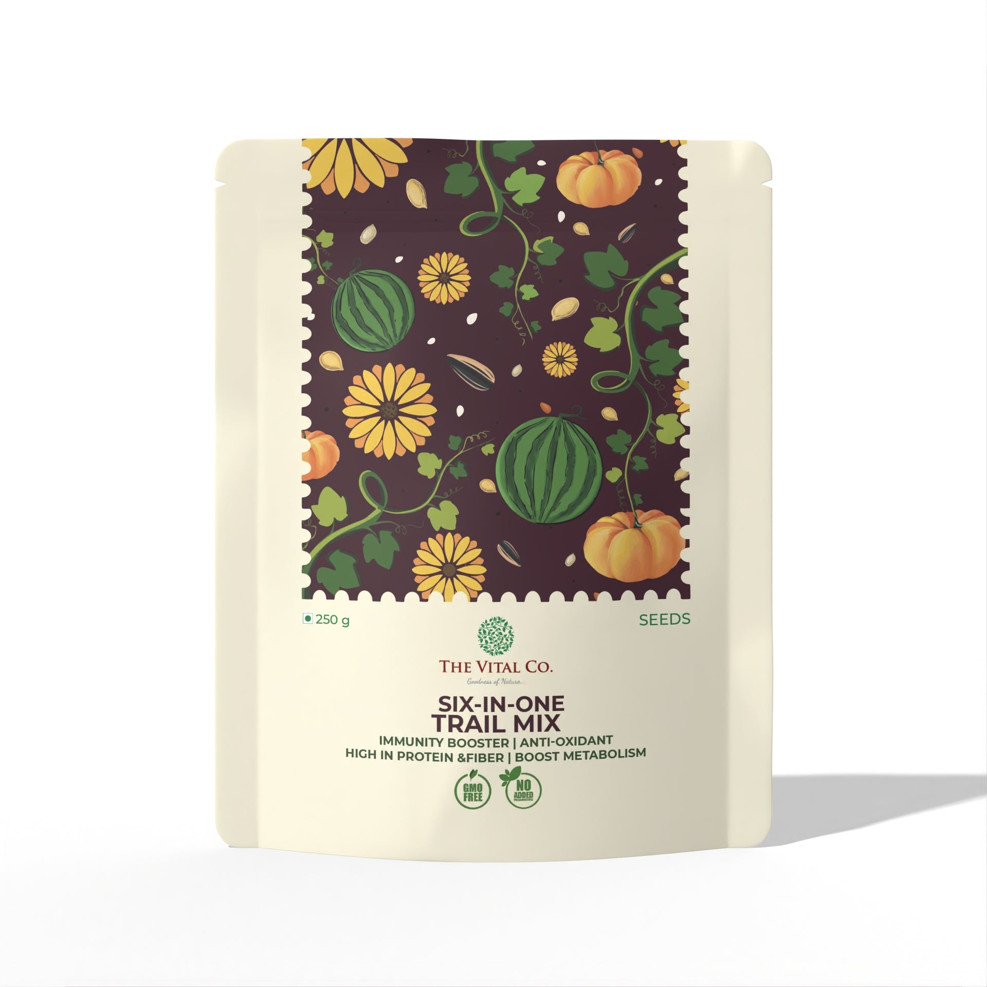 Six-in-One Seeds Mix delivers a crunchy, savory blend of plant-based protein, healthy fats, and antioxidants — ideal for snacking or adding to meals.