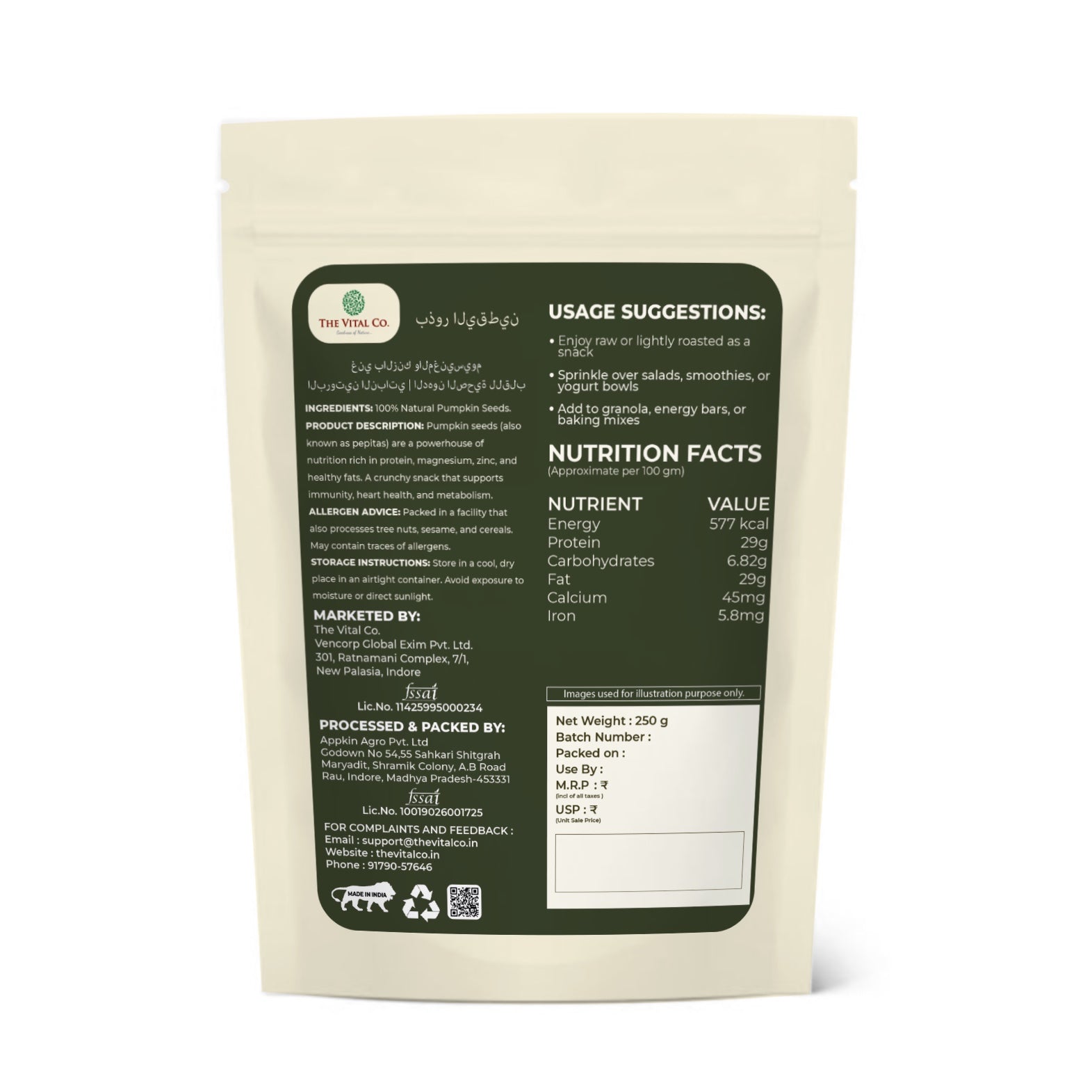 The Vital Co pumpkin seeds are free from fillers, blends, artificial colours and preservatives. They are packed in hygienic packs to preserve freshness because all the packs have uniform quality and nutrition.