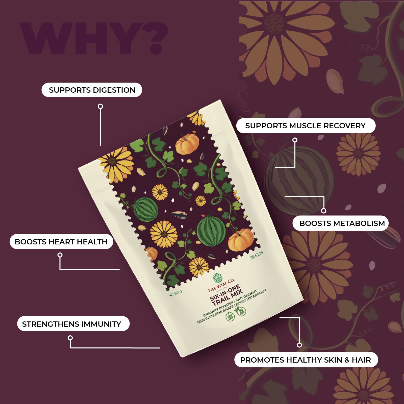 A seed mixture assists in digestion, energy, cardiovascular wellness, and general wellness. Combination of varying seeds gives one a great variety of nutrients which acts in unison to sustain day to day health requirements.